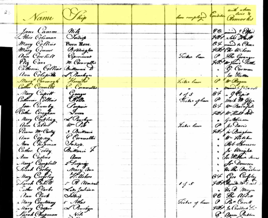 Several records showed her ship as the Hercules I, and another shows the Atlas. Doing some digging I found that both ships sailed right around the same time, leaving from Cork, Ireland in 1801. Female convicts were far fewer than males. The Hercules I had 140 men and 25 women. The Atlas 158 men and 28 women. Both ships departed from Ireland late in 1801 and sailed to Rio de Janeiro and then over to the cape (South Africa) and on across the Indian Ocean. (The Suez Canal had not been constructed yet). An exert from a book gives a horrifying account of the Atlas’ and an account of the Hercules voyage shows that it had a mutiny during the trip. So either ship – her experience had to be horrific.