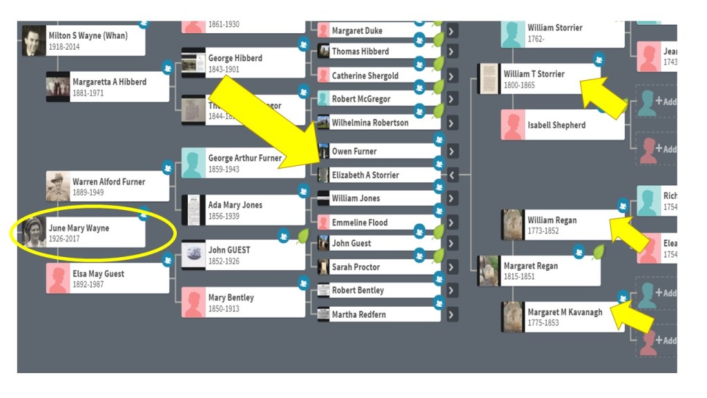 To illustrate where the people of these stories fall in the family tree – take a look at the image below. I circled June Wayne (Furner) so that you can trace back from her on her paternal side.