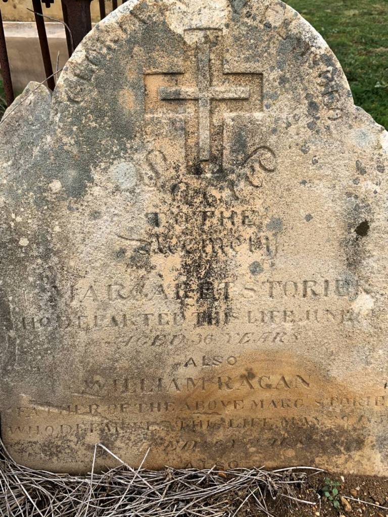 Margaret Regan Storrier’s headstone is shared with her father – not her husband. But I believe this is because she and her father are buried in the Catholic cemetery. On several of the convict musters, William Storrier is listed as “Church of Scotland”. Her father, William Ragan died only a year after her death in 1852 and then her mother (Margaret Kavanagh Regan) a year after that in 1853. Margaret’s brother John Regan (Elizabeth’s uncle) does live on to the age of 79.