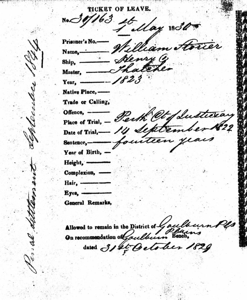 William Storrier was from Dundee, Scotland. There are four generations of Williams in his family, but I am pretty sure I have the right records. In 1822 William (age around 22 years old) and another guy were charged with a more serious crime; assault. They both are sentenced to 14 years “transportation” at the Perth (Scotland) court. He departs on the “Henry” in April 1823, arriving in New South Wales on August 26, 1823. His occupation is listed as butcher. On paper he does not sound like a great guy but at least he earned a ticket of leave six years later. A ticket to leave is like what we would call “probation” and was earned by working hard and staying out of trouble.