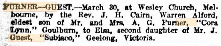 Within a year of their marriage, their first child, Geoffrey Furner (June’s older brother) was born on March 5, 1921 in Goulburn. Warren was 31 and Elsie was 29. Also it seems Elsie preferred the name Elsa as she began to use this more as she got older.