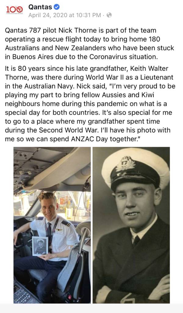 But one happy discovery (credit again to Victoria’s investigative skills) was the next picture found on the Facebook page of Qantas airlines. As mentioned in the news clipping, Keith was a World War 2 Navy veteran. Two generations later, his grandson is a pilot for Qantas airlines and flew a special mission with his grandfather’s photograph.