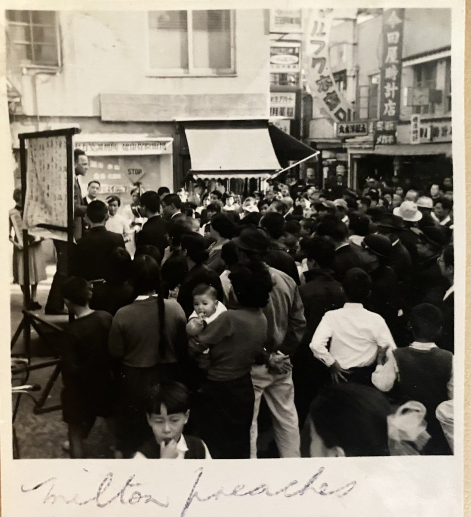 I was invited to minister at the Shinkaichi Mission Hall in Kobe, the place the dentist had pointed out to me six years before. (Mary: for readers of previous posts, this was when Milton took a train to Kyushu to scout a place to live, before he, June & baby Stan left Tokyo back in 1949) Night after night, in the street and in the Mission Hall I preached and worked alongside a Japanese evangelist and teams of students from the J.E.B. Bible College.