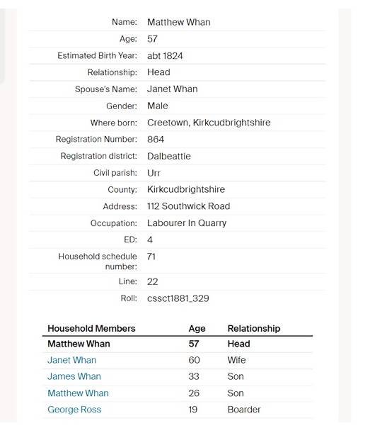 Mary: “dear old mother” is Janet Cameron (Whan) Janet was born in Creetown. She is the oldest of three siblings born to David Cameron and her mother Marion. Sadly, Janet’s mother died when Janet was only seven years old. Pretty soon after that, David Cameron remarried to Mary Brown. Mary (Brown) and David had 8 more children. More on that later in this post.