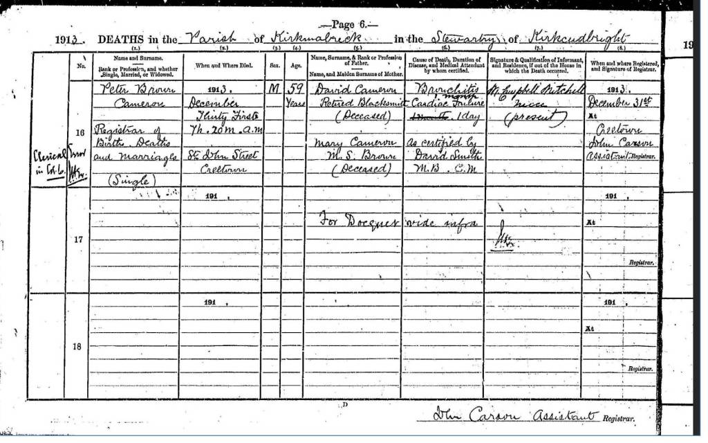 Peter died in 1913. At the time of his death and on a census before that, he was the local registrar of births.