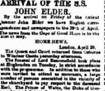 By looking for newspaper records, I found that the John Elder arrived in Adelaide on June 11th and then on to Melbourne. As it mentions, the arrival of the ship meant arrival of news from England for those in Australia.