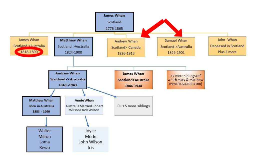 Now for the letters. The first excerpt is a letter from Samuel to Andrew with some bad news. The James mentioned here is their brother James. Not to be confused with “Young James” from the previous posts who was their nephew and Matthew’s son. I still get confused with the Whan tree so as a reminder, I posted the tree image above, with key figures highlighted:
