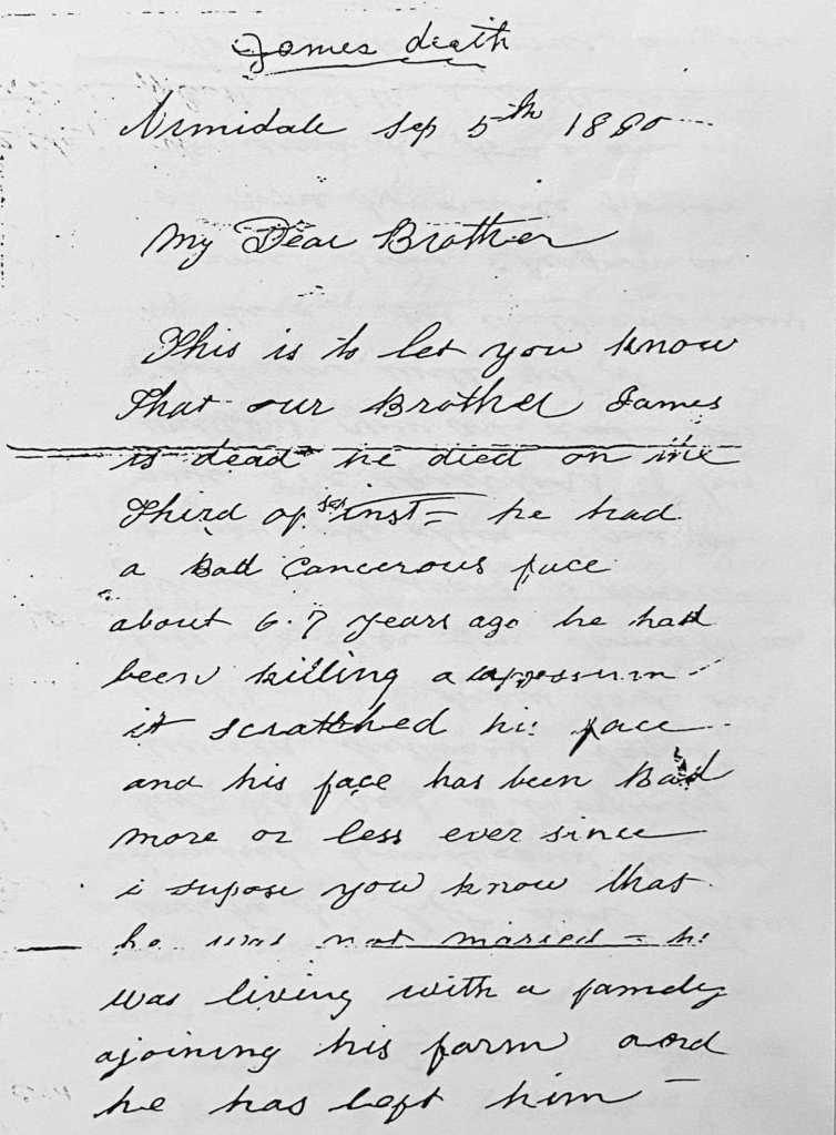 This is to let you know that our brother James is dead. He died on the third of September. He had a bad cancerous face. About 6 or 7 years ago he had been killing a possum and it scratched his face and his face has been bad more or less ever since. I suppose you know that he was not married. He was living with a family adjoining his farm and he has left them three hundred pounds and he has left the rest to be equally divided between Samuel, Matthew, Andrew, and our late brother’s son, James Whan in Glasgow. I want to know if you are alive. I must give the executors of his will if you are dead the children will get it if dead his children must name some clergyman or some honorable person to send it to. I am in bad health I will … (a few words are on a fold and hard to read).